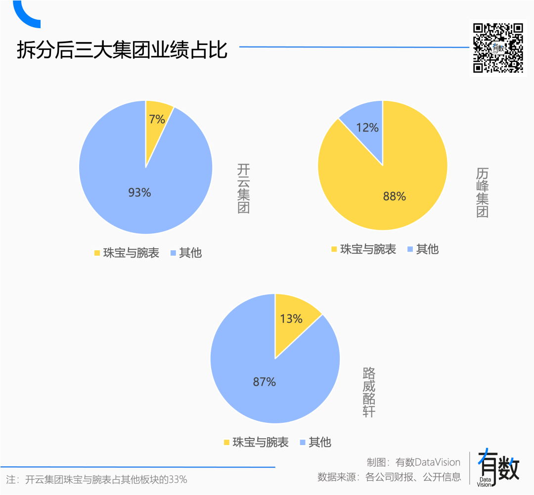 按照三方财报的口径,历峰珠宝部门营收占比高达73%,远远超过LVMH和开云。如果我们将三大集团的营收结构分为珠宝与腕表和其他两大类,历峰就是一个如假包换的珠宝公司。