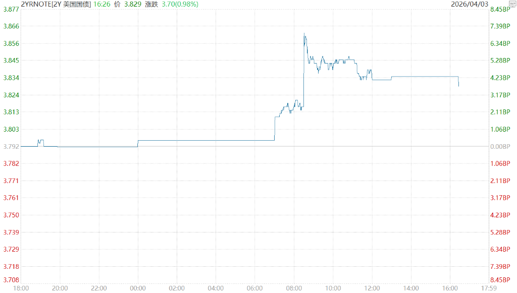 两年期美债收益率上行3.7个基点,报3.829%。(美国2年期国债收益率)