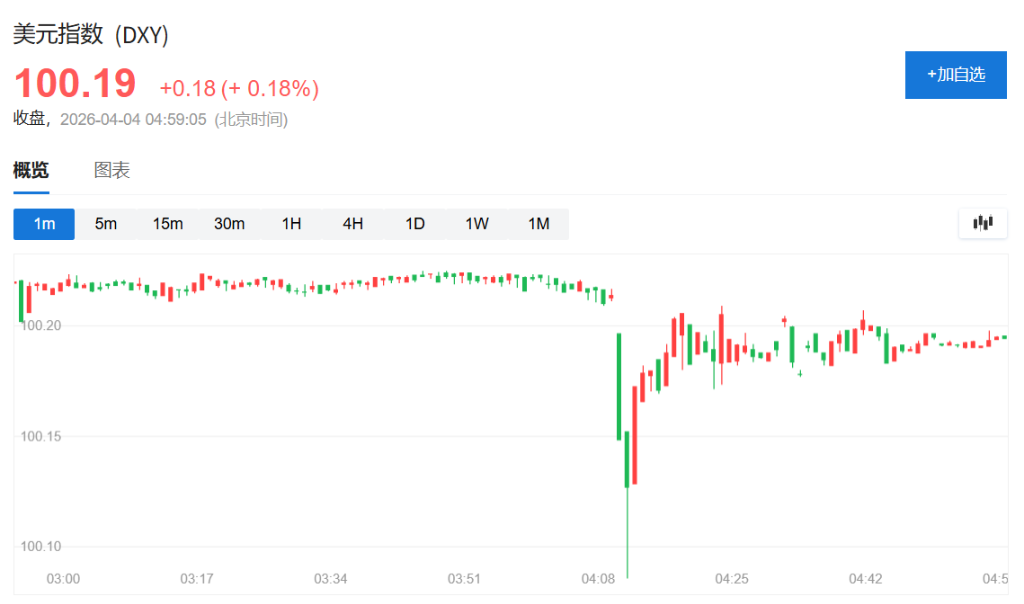 纽约尾盘,ICE美元指数微涨0.1%,非农数据公布后瞬间拉升至100.160刷新日高,随后回落至100下方。(美元指数交投清淡)