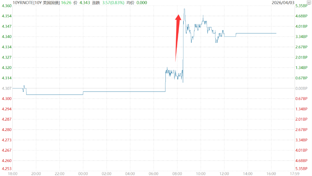 数据公布后,对利率走势敏感的2年期美债收益率一度上行6个基点至3.86%,10年期收益率同步上升超5基点。