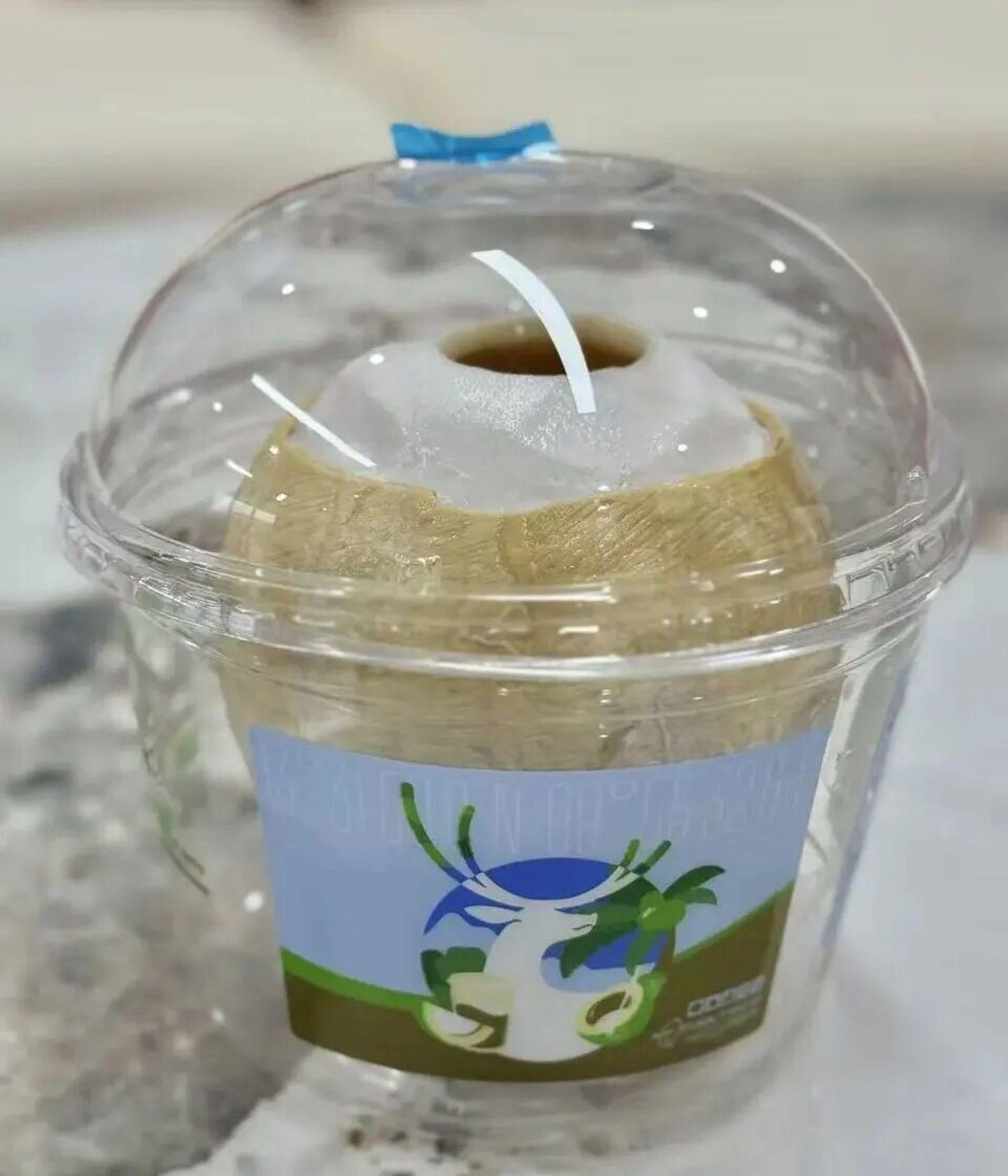 椰子是整颗开口的,顶部敞开,没有任何封口设计。放进外卖袋,稍微晃一下就能洒出来。加上冷冻储存的椰壳,随着温度回升开始化冰,整颗椰子在盒子里会轻微移动,自提尚且要小心端着,外卖这道工序几乎天然失败。