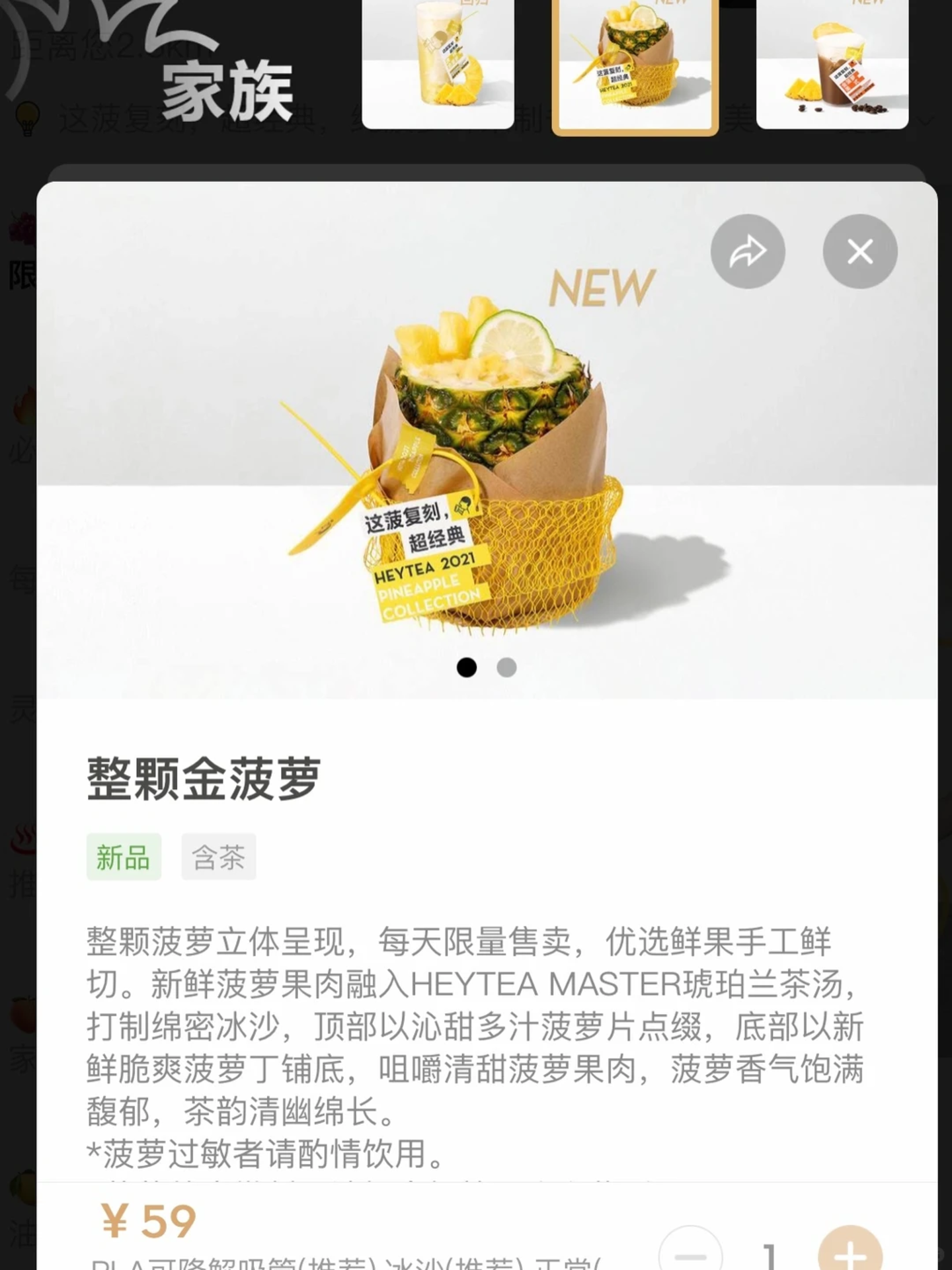 2021年喜茶也曾推出过一整颗菠萝做容器的鲜果饮品,一颗完整的菠萝挖空装进茶饮,售价高达59元,门店外照样排着队拍照。