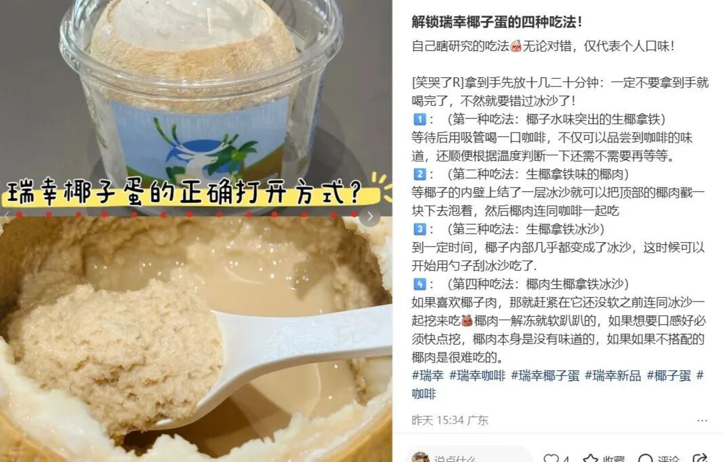 这也是这一新品最大的宣传点。官方推荐的顺序是:一喝咖啡,二吃沙冰,三刮椰肉。围绕这个顺序,小红书上甚至发展出了一套完整的食用攻略。
