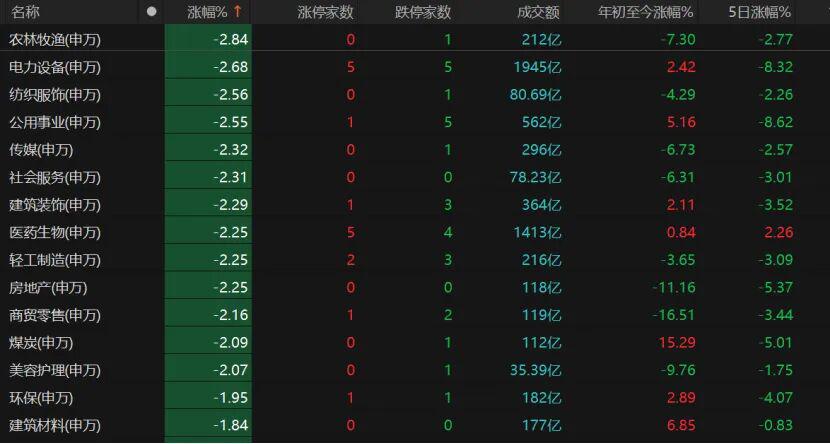 跌幅超2%的有13个板块,其中农林牧渔、电力设备领跌,近日表现不错的医药生物也回调。