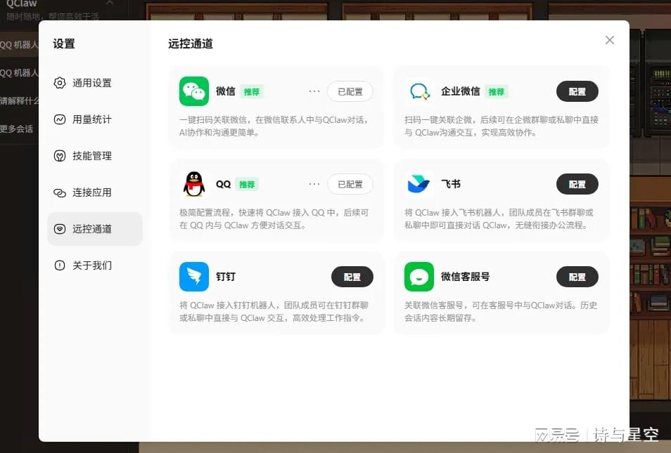 更匪夷所思的是,Qclaw直接在界面提供了飞书、钉钉的快捷配置通道。