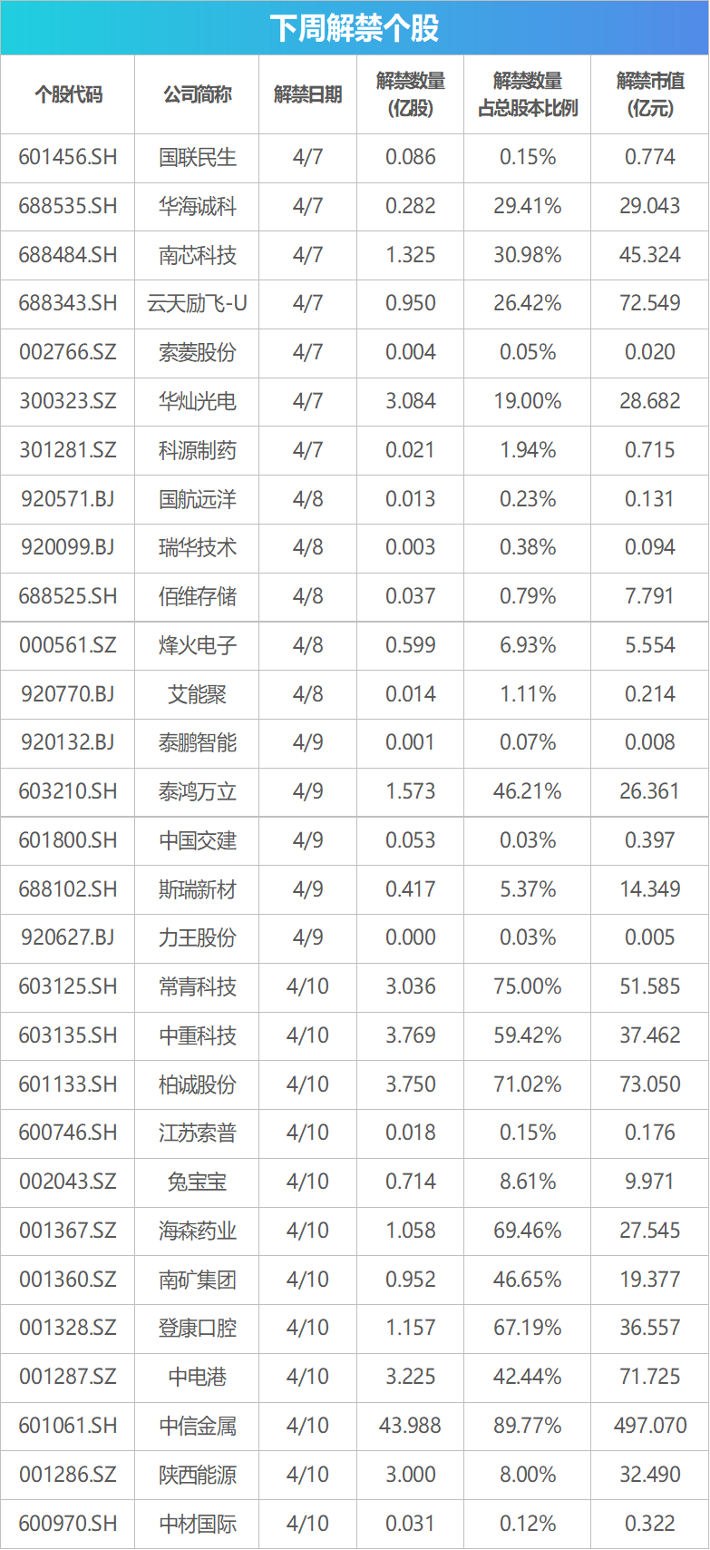 Wind数据统计显示,下周(4月6日至4月10日)共有29只限售股解禁,按最新收盘价计算,解禁总市值近1090亿元。