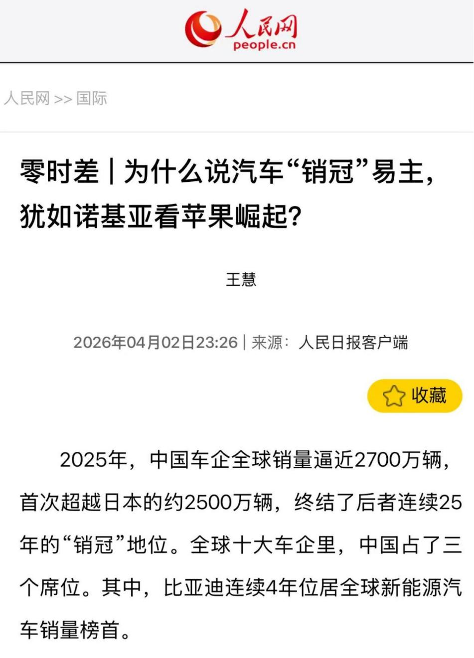 4月2日,《人民日报》深夜发文,直指全球汽车格局巨变,2025年中国车企全球销量首次超越日本,终结了日本长达25年的汽车销量霸主地位。