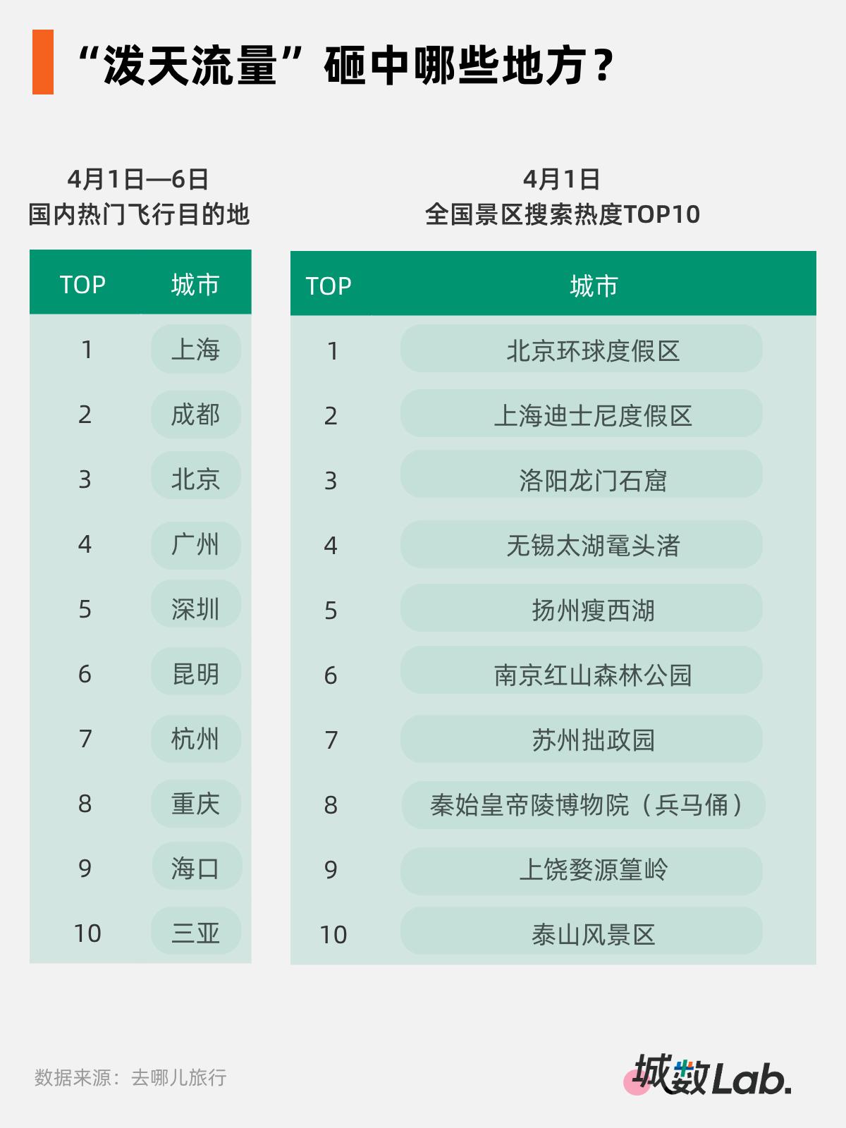 去哪儿旅行公布的4月1日—6日最热门飞行目的地TOP10,分别为:上海、成都、北京、广州、深圳、昆明、杭州、重庆、海口、三亚。