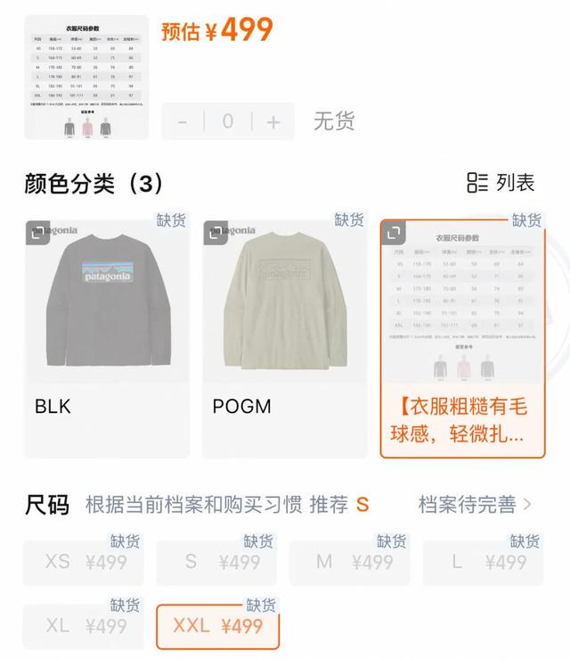 有意思报告发现,在Patagonia的天猫旗舰店里,有的热门款式不同颜色、不同尺码均呈现出缺货状态。这一点在线下店也有所体现,据毒师观察,Patagonia直营店里也经常没货卖。