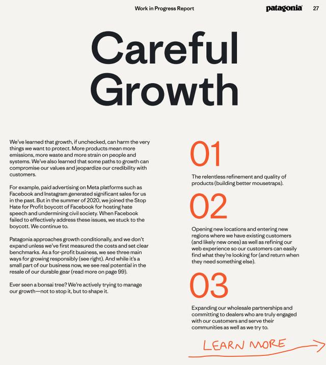 从更广的层面来看,Patagonia对所有市场都采用“Careful Growth(谨慎增长)”的策略。在年度工作进展报告中,Patagonia这样写道:“若任其发展,增长可能会损害到我们原本希望保护的那些事物。产品数量的增加意味着排放量的增多、废弃物的增加,这些都会对人类和系统造成更大压力。我们还了解到,某些促进增长的途径可能会损害我们的价值观。”