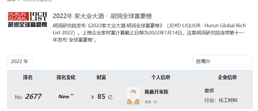 2022年,陈雁升家族以85亿元财富值进入胡润全球富豪榜,排名2677位。