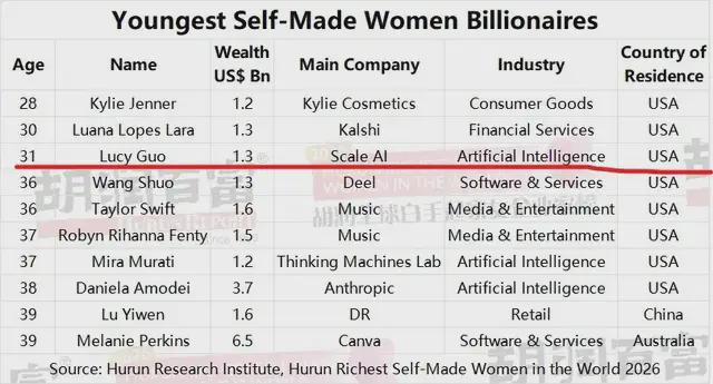 在胡润研究院2026年3月发布的《全球富豪榜》上,一批深耕AI领域的女性创业者格外耀眼。其中,31岁的华裔女性LucyGuo一骑绝尘,以90亿元人民币身家登顶全球90后白手起家女首富,成为AI造富浪潮里最鲜活、最具传奇色彩的缩影。