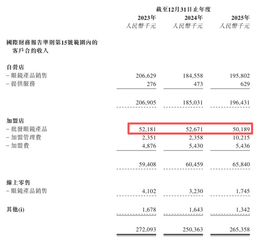 加盟店的数量下降导致批发眼镜的收入下降,但是收入却逆势增加,答案藏在加盟管理费。公司加盟管理费从前一年的235.8万元增加到2025年1021.50万元,同比增幅333.20%,原因是公司自2025年起向浙江省内165家加盟店统一开征6%的管理费。