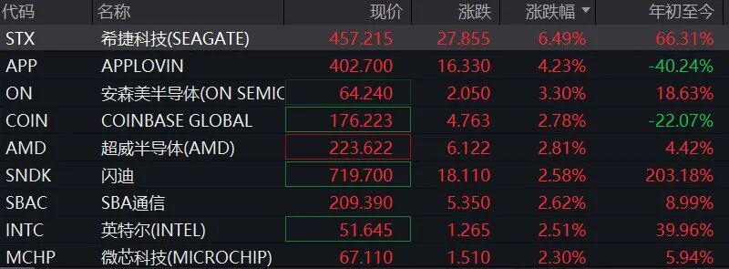 存储芯片板块普涨,希捷科技涨超5%,闪迪涨超2%,美光科技涨近2%。奈飞上涨2.7%,高盛将其评级从中性上调至买入。