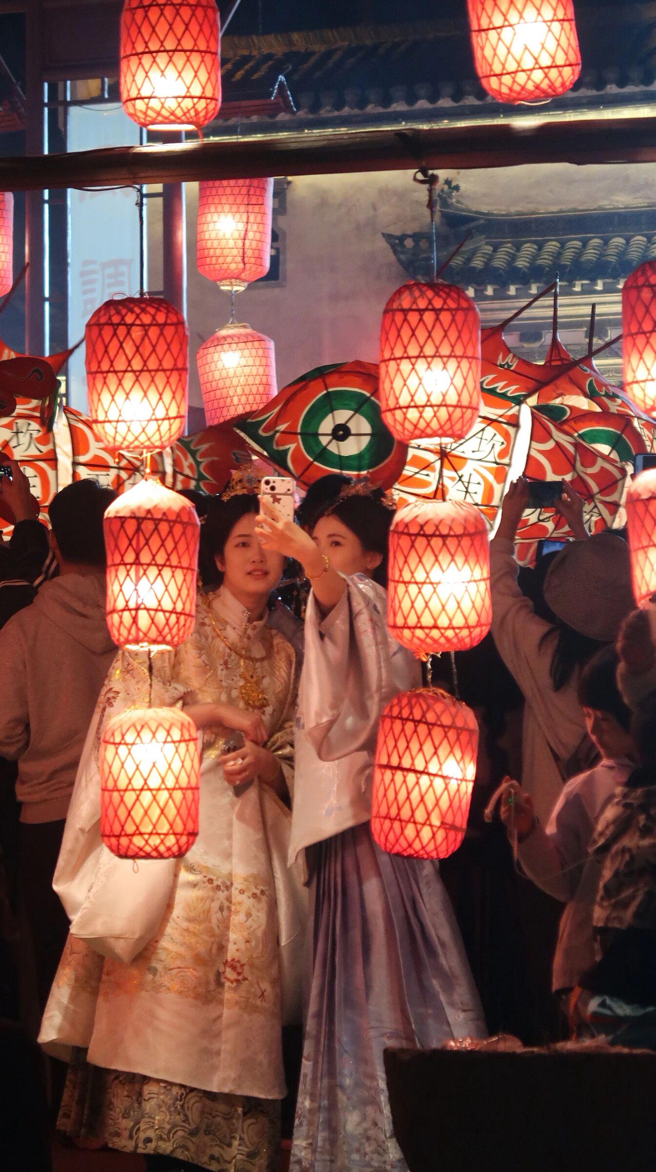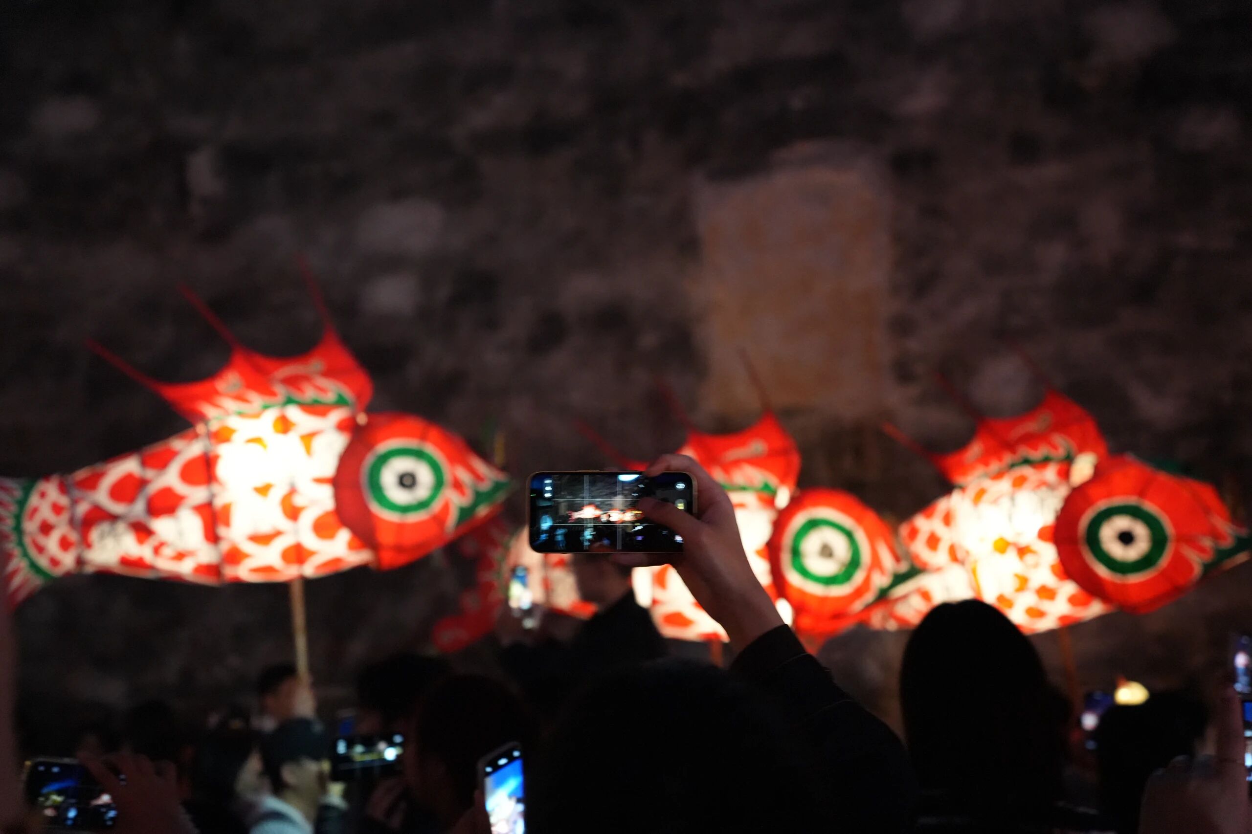 9、6点38,鱼灯表演正式开始。为了出片早早在湖边排队的我们没有看到前面的表演,直到鱼灯队走到桥边,烟花、鱼灯、热闹的人群,抬头就能看到的红灯笼,很难想象,我在4月5日这天晚上看到如此红火、像过年的场景。