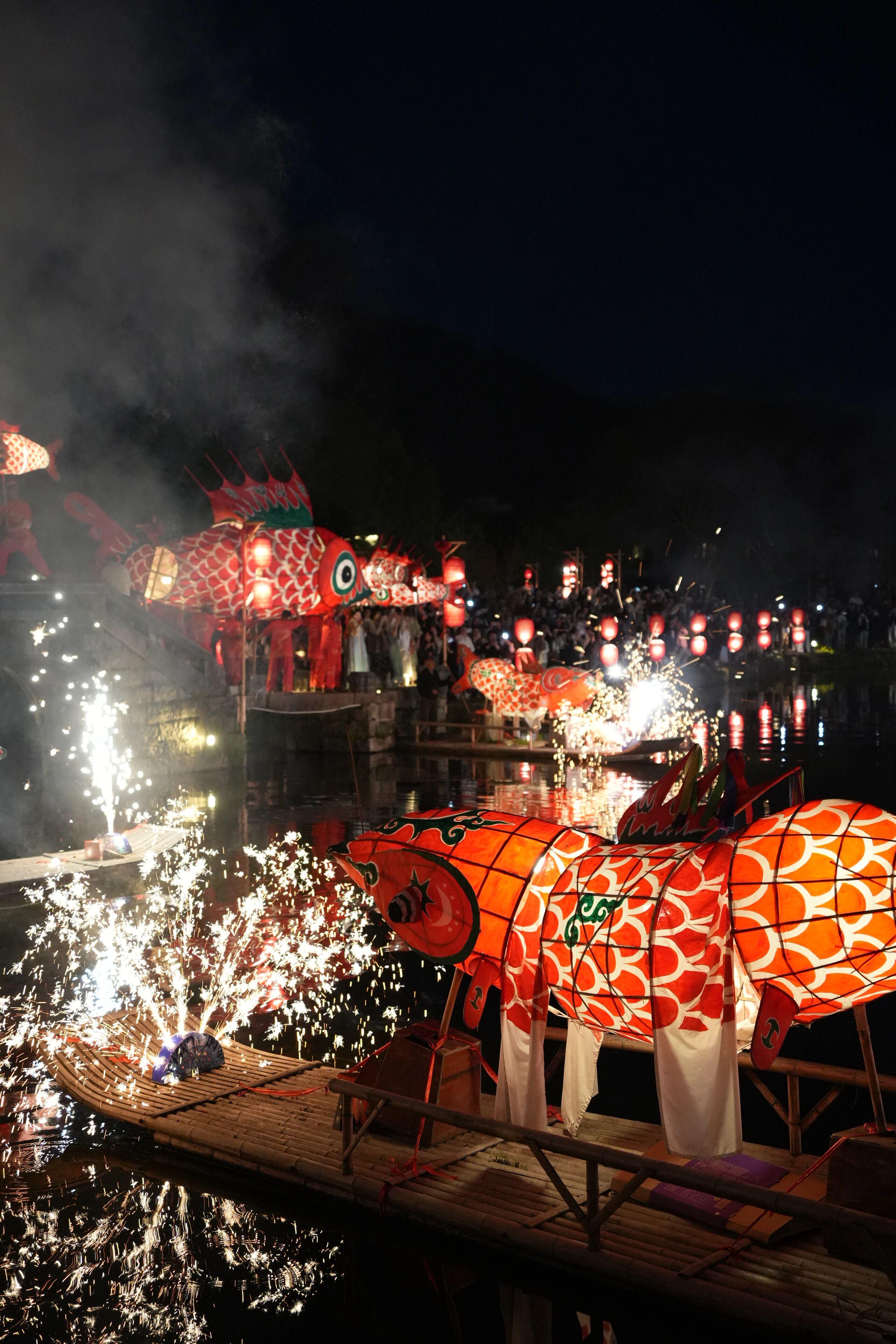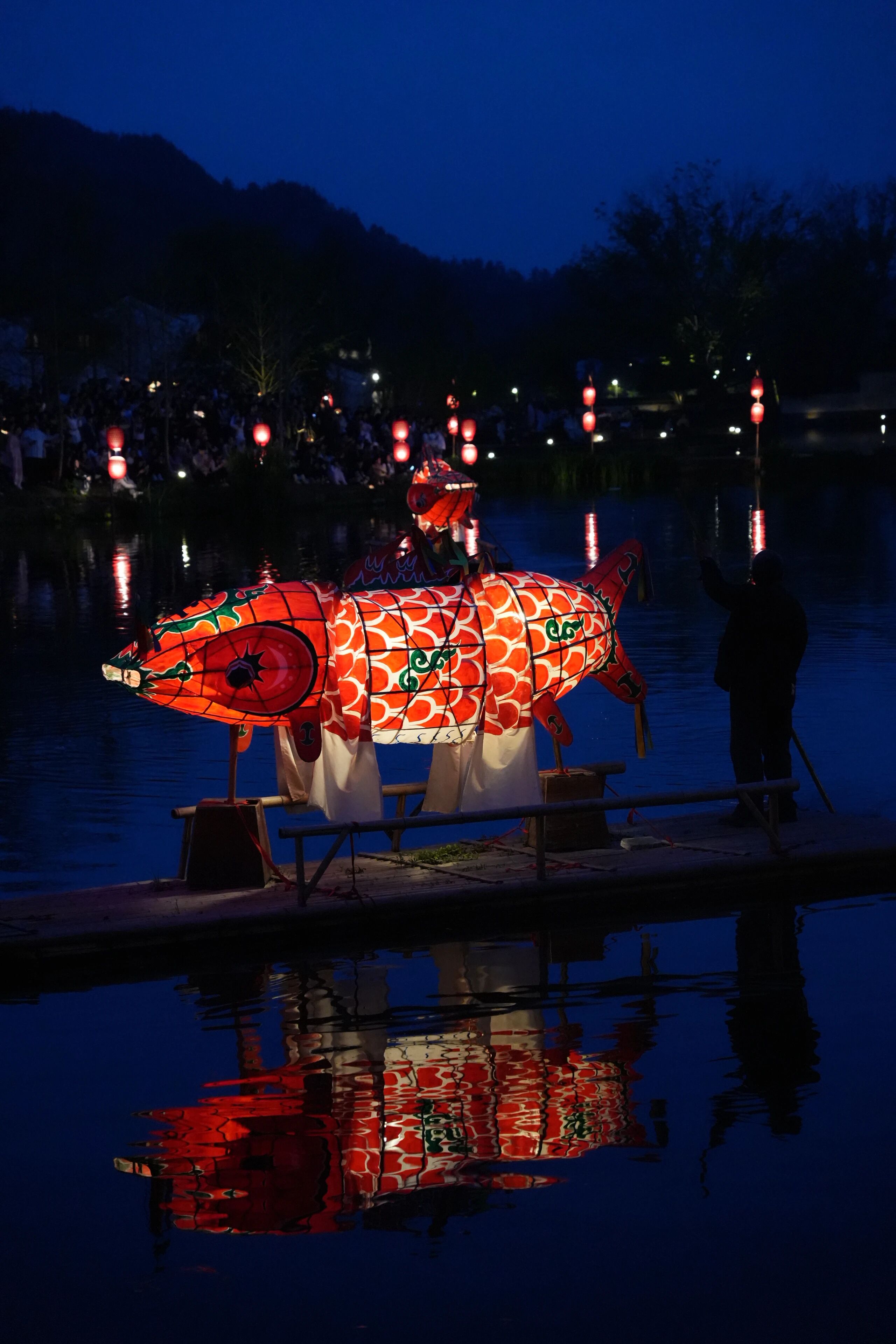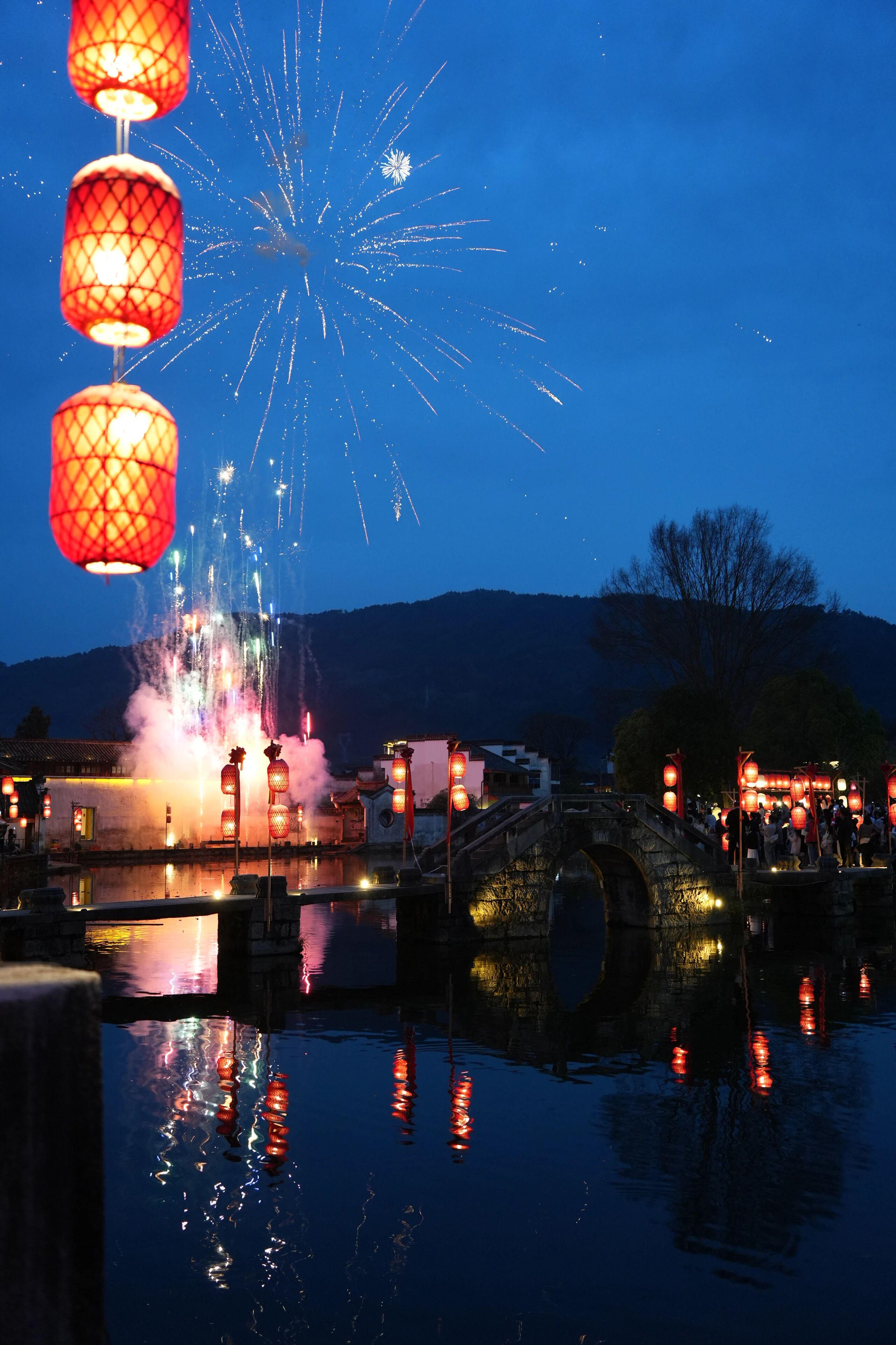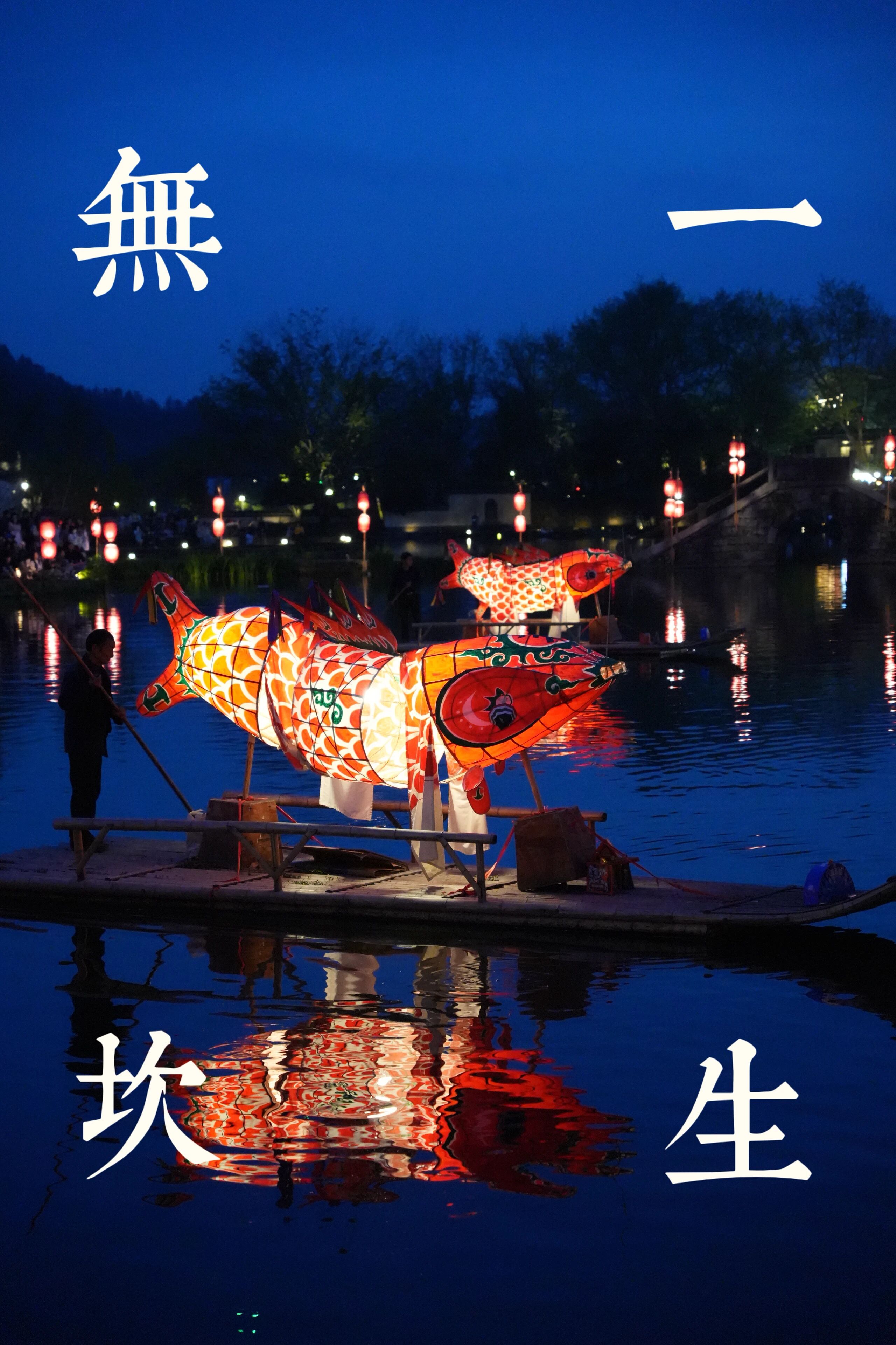 6、重点是看鱼灯,整个呈坎的核心景区也是为鱼灯表演打造,每晚18点38有鱼灯表演和烟花秀,围绕着永兴湖,官方贴心地放置好多个「最佳出片点」。
