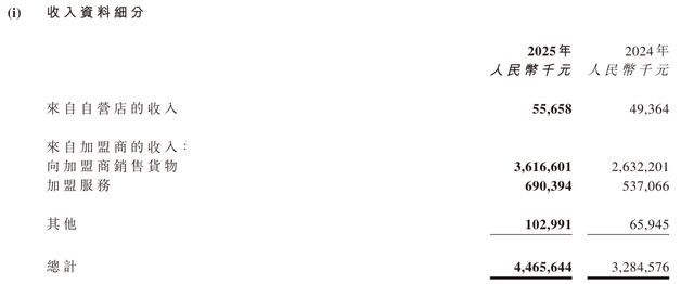 其他五家则依靠加盟,它们卖的不是奶茶,而是向加盟商出售原料、设备、包装材料和品牌服务。加盟商越多、门店开得越多,收入越高。开店本身就是赚钱的方式。