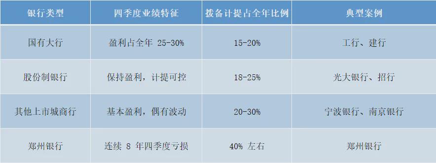 与同业相比,郑州银行的四季度亏损模式更显特殊。国有六大行四季度多为业绩冲刺期,净利润占全年比例达25%-30%,从未出现亏损;全国性股份制银行即便加大拨备计提,也能保持季度盈利,如光大银行2025年四季度计提175.88亿元,仍实现净利润18.08亿元;其他上市城商行偶有四季度利润波动,但均未出现连续8年亏损的情况。对比之下,郑州银行四季度40%左右的拨备计提占比,远高于行业15%-30%的平均水平,这也成为其持续亏损的直接推手。