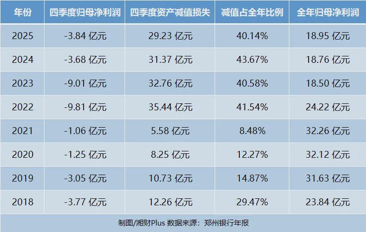 年报披露的数据显示,郑州银行2025年前三季度累计实现归母净利润22.79亿元,而全年仅为18.95亿元,第四季度单季亏损3.84亿元,直接吞噬了前三季度近17%的盈利成果。在此之前,该行2018至2024年四季度归母净利润从未实现盈利,亏损额在1.06亿元至9.81亿元之间波动,其中2022年亏损幅度最大,达9.81亿元,2021年亏损最小,仅1.06亿元,接近盈利边缘。