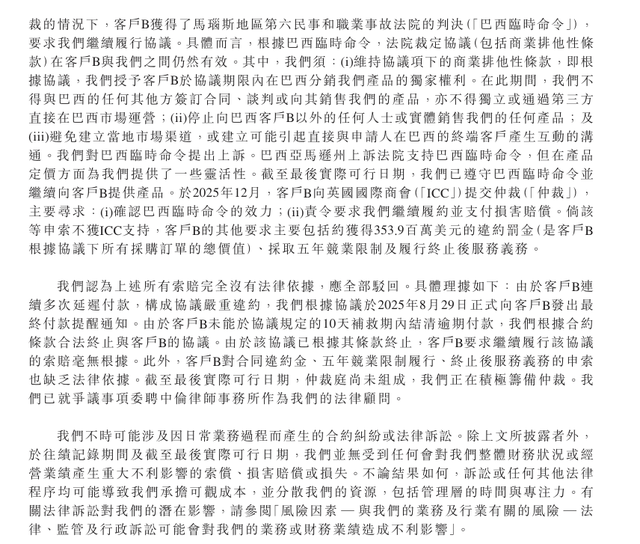 由于客户B连续多次延迟付款,商米于2025年8月发出最终付款提醒通知,并于9月合法终止协议。随后,客户B在未提交仲裁的情况下从巴西法院获得判决,要求商米继续履行协议。2025年12月,客户B向国际商会提起仲裁,索赔金额约3.539亿美元,并要求采取五年竞业限制。