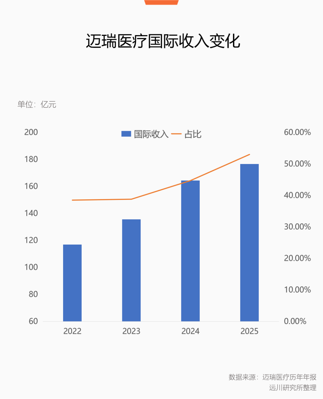 拆开来看,问题主要出在国内,年报显示,2025年迈瑞国内业务实现收入156.32亿元,同比下降22.97%;国际业务实现收入176.50亿元,同比增长7.40%,占总收入比重提升到53%。