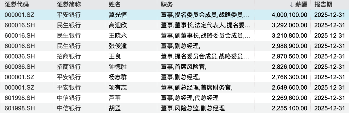 平安银行行长薪酬400万元居前列