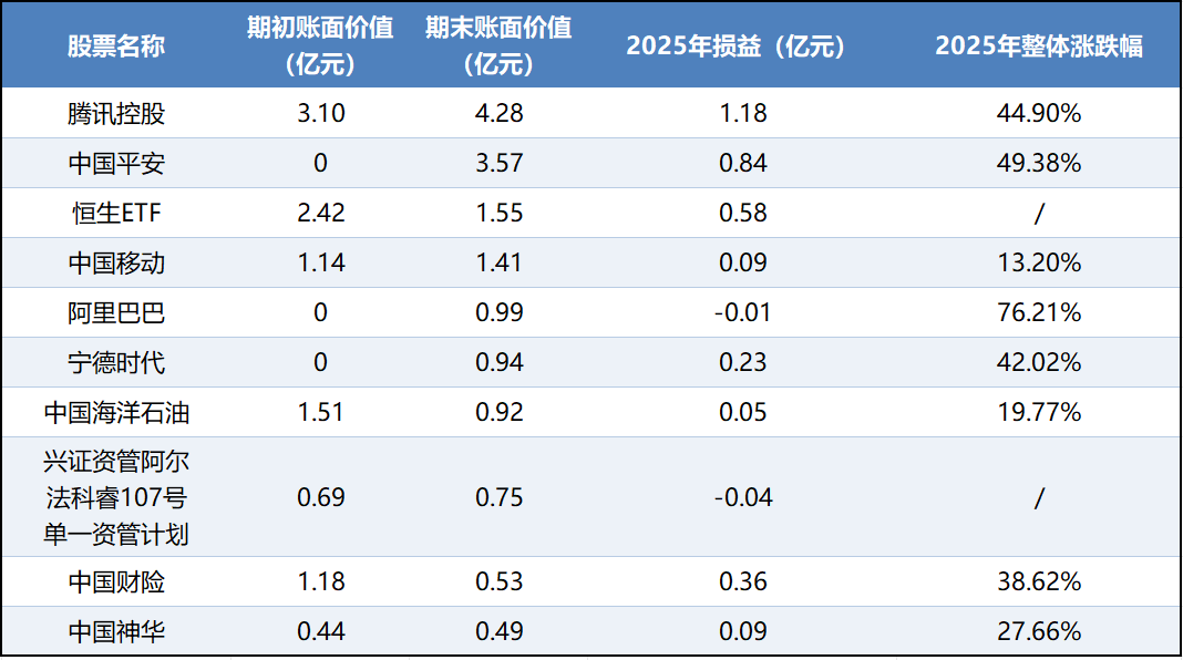 2025年内,七匹狼10只重仓的股票、基金、资管计划中,有8家取得了正收益,仅阿里巴巴及兴证资管计划损益为负。年内,公司通过证券投资获得的收益合计高达3.69亿元。