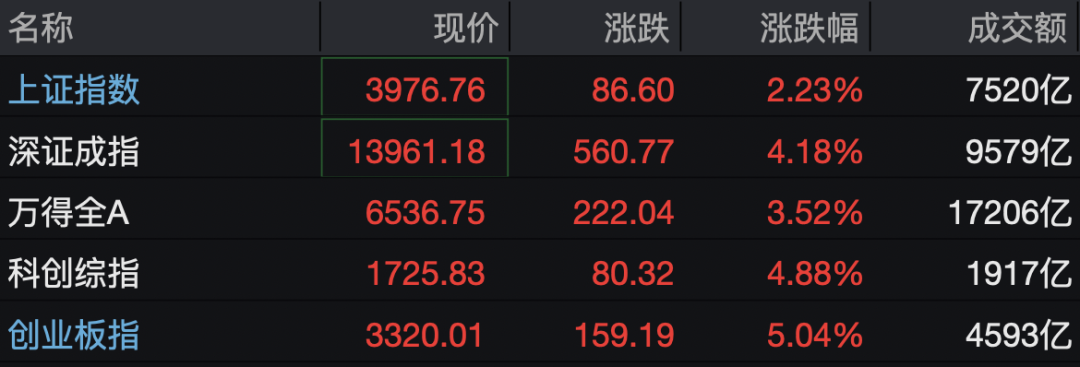 A股四大指数午后再度拉升,创业板指涨幅扩大至5%,上证指数涨逾2%,深证成指涨逾4%,科创综指涨近5%。