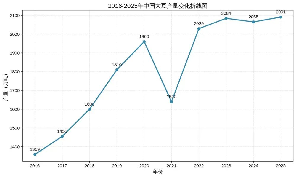 2025年,全国大豆产量达2091万吨,再创历史新高。