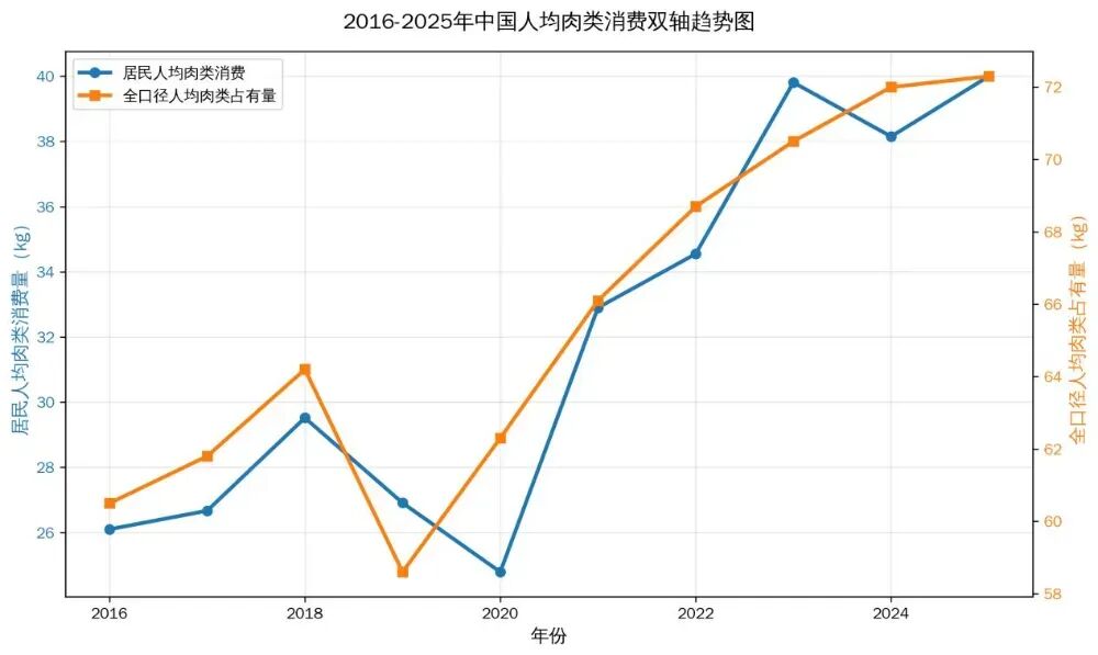 2025年,中国人均肉类消费量73公斤,比10年增长了22%,奶类、禽蛋消费量也实现同步翻倍。