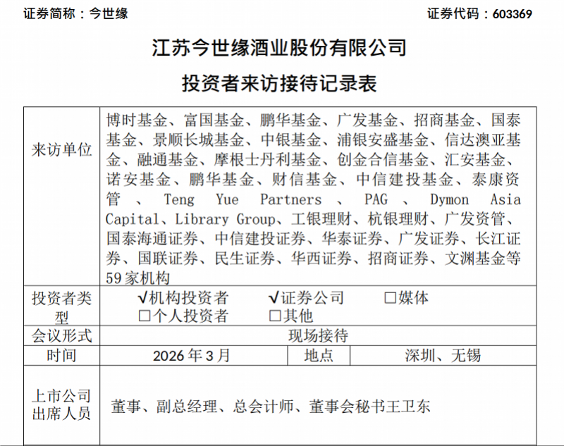 近日,今世缘发布了《江苏今世缘酒业股份有限公司投资者来访接待记录表》(2026年3月) ,今世缘董事、副总经理、总会计师、董事会秘书王卫东接待了包括博时基金、富国基金、鹏华基金、广发基金、招商基金、国泰基金等59 家机构的投资者并回复了机构提出的28个问题,涉及核心产品销售情况、渠道库存、战略调整等。