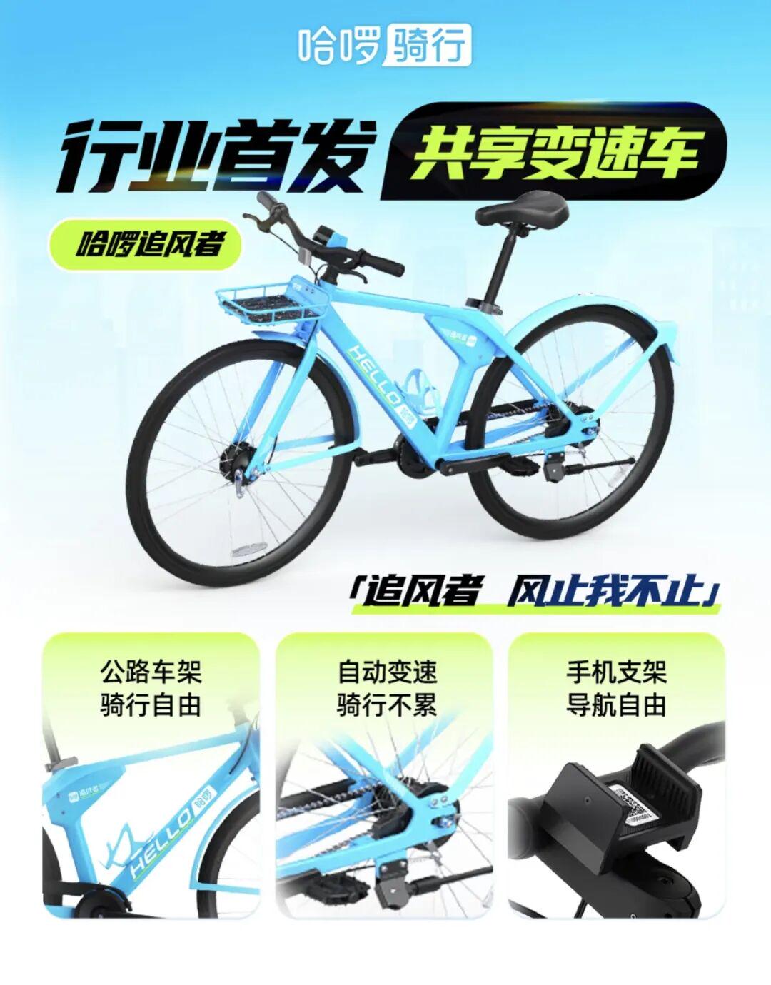 4月8日,哈喽单车官宣「行业首发」变速共享单车——哈啰追风者变速车,第一波在天津投放上线。
