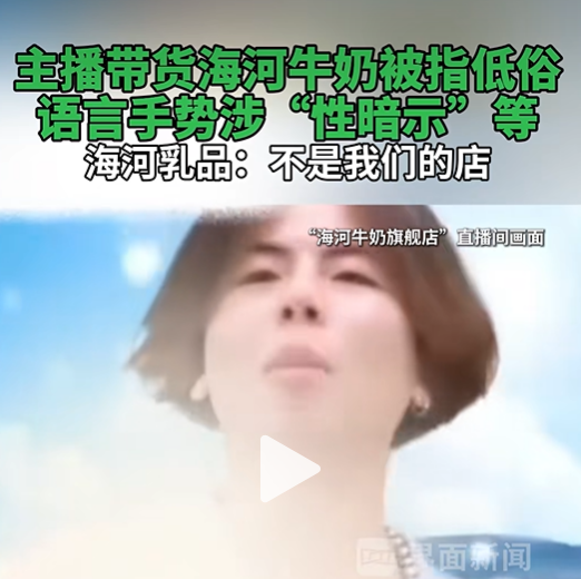 近日,海河牛奶旗舰店抖音直播间的一名主播直播带货时言论涉黄涉低俗引发外界关注。有网友反映“海河牛奶旗舰店”直播间男主播使用“崩锅”等性暗示黑话及不雅动作【天津方言中的涉黄隐语(崩=打,锅=炮)】,有家长称六年级女儿因此学到不良词汇。品牌方在最初回应“管不了”之后,已于4月8日凌晨发布致歉声明,承认“负有不可推卸的监管责任”。
