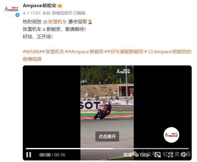 红星资本局4月8日消息,日前,宁德时代(300750.SZ)子公司厦门新能安科技有限公司(简称“新能安”),通过社交账号发布了一则“张雪机车×新能安,好戏正开场,敬请期待”的主题视频,引发业内对双方可能展开合作的广泛猜测。