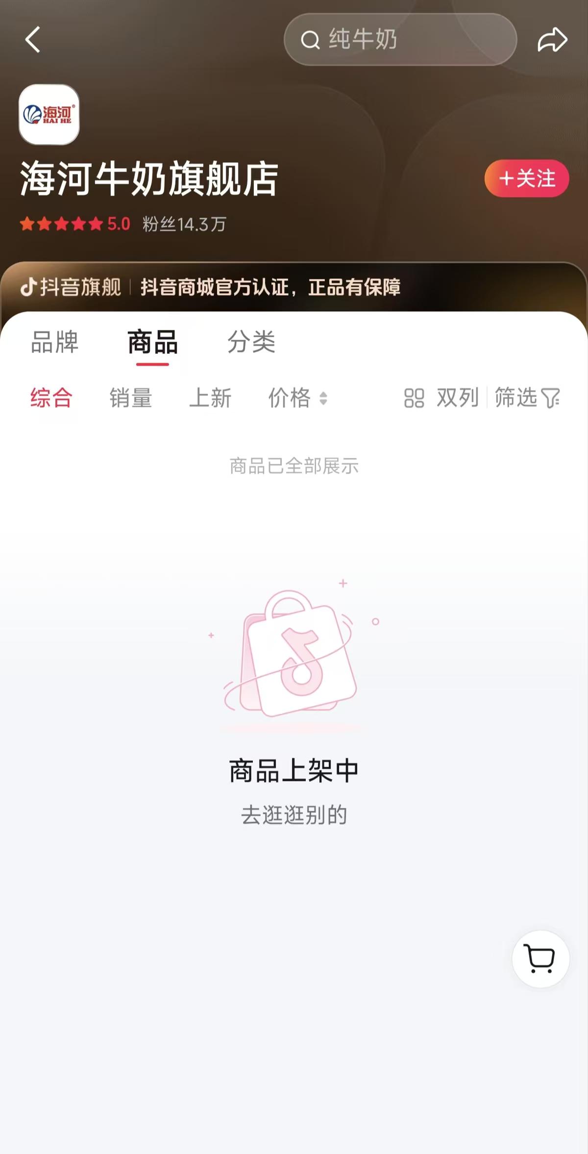 红星资本局注意到,海河牛奶旗舰店共有14.3万粉丝,目前店铺已无商品在售,页面显示“商品上架中”。