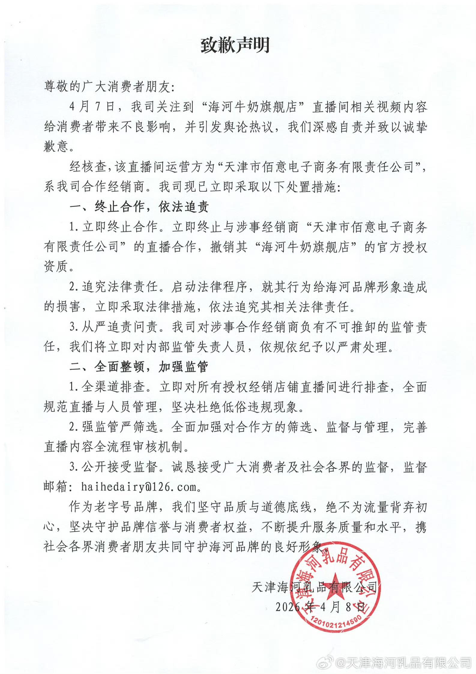 对此,4月8日,海河乳品发布致歉声明称,经核查,海河牛奶旗舰店直播间运营方为佰意电子商务,系该公司合作经销商。海河乳品已立即终止与涉事经销商佰意电子商务的直播合作,撤销其海河牛奶旗舰店的官方授权资质。同时,启动法律程序,就其行为给海河品牌形象造成的损害,立即采取法律措施,依法追究其相关法律责任。