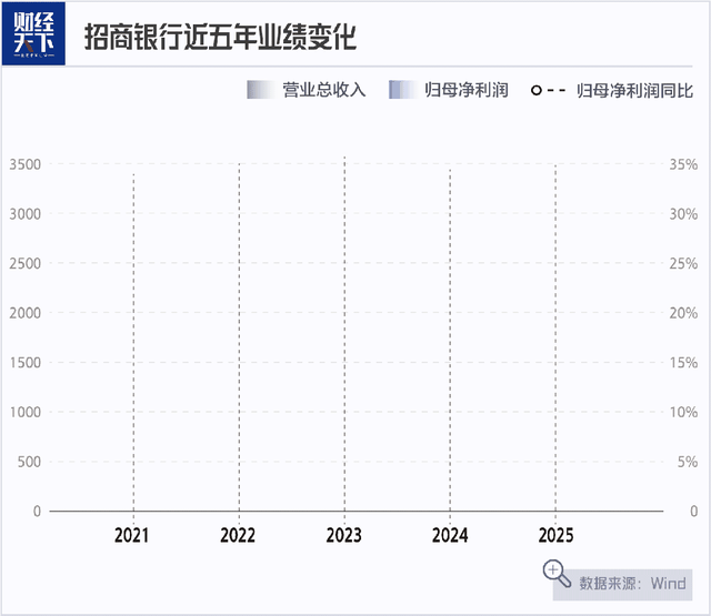 局部数据只呈现乐观的一面。拉长时间来看,2021年,招商银行营收和净利润还都是两位数增长,此后几年增长逐渐变为个位数甚至负数,2025年营收仅实现0.01%的微增。