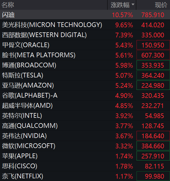 科技股集体反弹,闪迪涨超10%,美光科技涨超9%,西部数据涨超7%,甲骨文、特斯拉、博通、亚马逊涨超5%,谷歌涨超4%,英特尔、英伟达涨超3%。