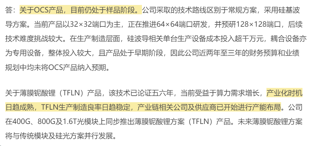 答:关于OCS产品,目前仍处于样品阶段。公司采取的技术路线区别于常规方案,采用硅基波导方案。当前产品以32×32端口为主,正在推进64×64端口研发,并预研128×128端口,后续技术难度挑战较大。在生产制造层面,硅波导相关单台生产设备成本投入超千万元,耦合设备亦为专用设备,整体投入较大,且产品处于早期阶段,因此公司近两年至三年的财务预算和业绩规划中均未将OCS产品纳入预期。