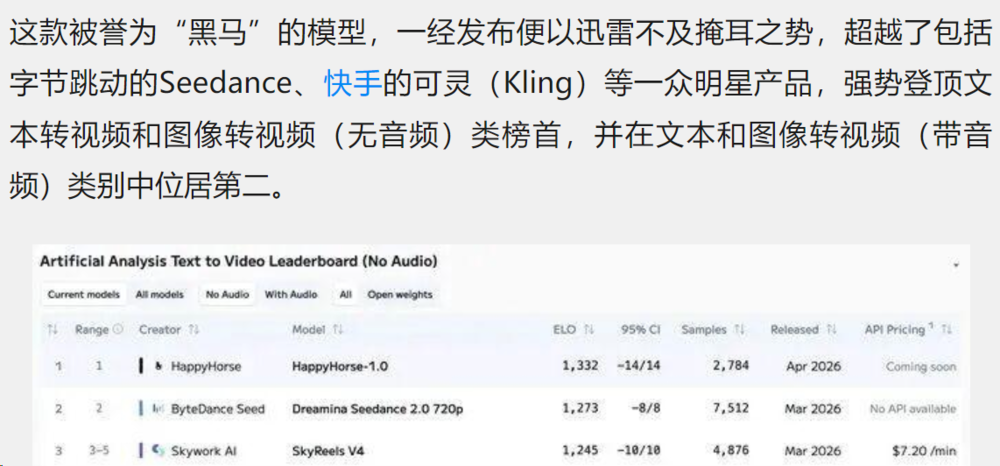没有发布会,没有技术博客,没有任何公司背书——一款名为HappyHorse-1.0的文本转视频模型,悄然登顶权威AI评测平台ArtificialAnalysis的AIVideoArena排行榜,以更高的Elo分数压过了Seedance2.0,更将可灵、天工等一众主流玩家甩在身后,一时之间引发了技术圈的“解密竞赛”。