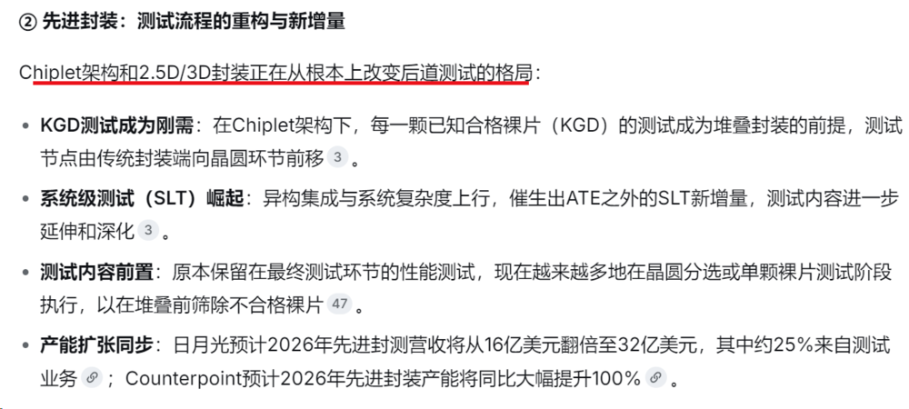 2026年后道测试的发展增量,本质上由AI算力的"高复杂度"、先进封装的"结构重构"、汽车电子的"严苛标准"三重力量共同推动,叠加国产替代从"突破点"向"面"扩散。以AI为代表的结构性增长已足以驱动整体市场持续扩张。后道测试正从封测环节的"配角"走向价值链条的"核心支点",这一趋势在2026年将更为明确。