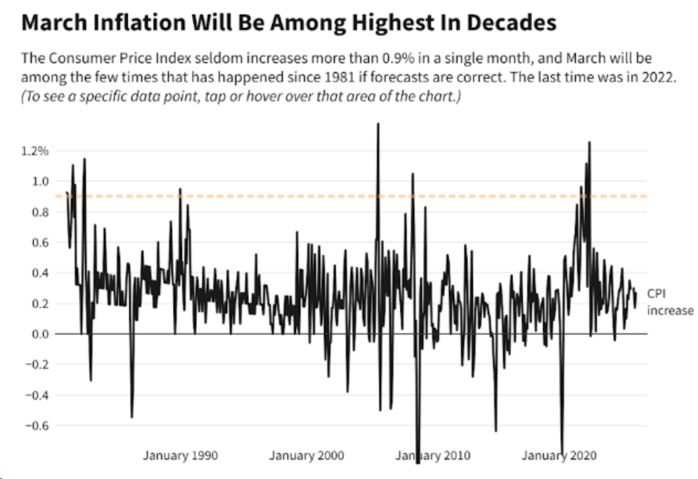 由于伊朗战争推高了汽油价格,3月份美国CPI可能大幅上涨,成为历史上通胀飙升幅度最大的月份之一。据媒体对经济学家的调查显示,经济学家预计定于周五发布美国CPI报告将显示,3月份美国通胀率环比上升0.9%。