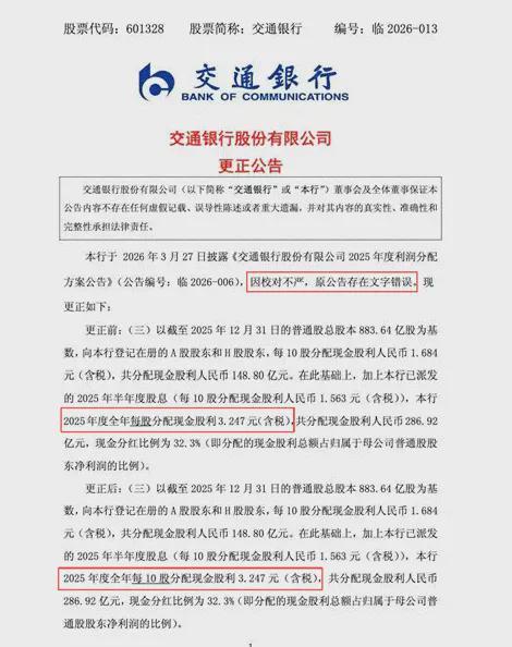 这一天,交通银行发布2025年度利润分配方案公告,把"每10股派发现金股利3.247元"——误写成了——"每股派发现金股利3.247元"。