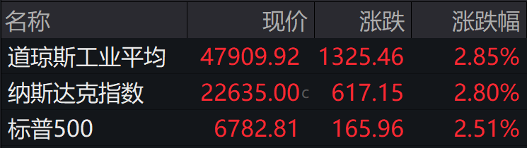 ►►当地时间周三,美股三大股指高开高走,标普500指数逼近6800点。截至收盘,道指暴涨2.85%,纳指飙升2.80%,标普500指数大涨2.51%。
