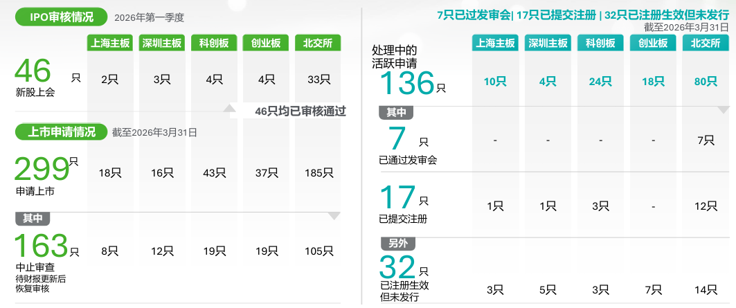 与此同时,德勤指出,2026年一季度,A股IPO上会数量和申请数量均较去年出现上升。上会方面,一季度A股共有46只新股上会,北交所有33只,科创板、创业板均分别有4只,深交所主板有3只,上交所主板有2只。