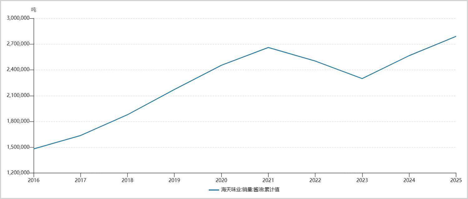 2016至2025年,海天酱油销售量从148万吨提升至279万吨,期间虽有波动,但整体向上。2024年,海天在中国酱油市场的份额为13.2%,2025年逆势保持上升,而同期千禾、中炬高新等主要对手显示不同程度的下滑(2025年前三季度)。