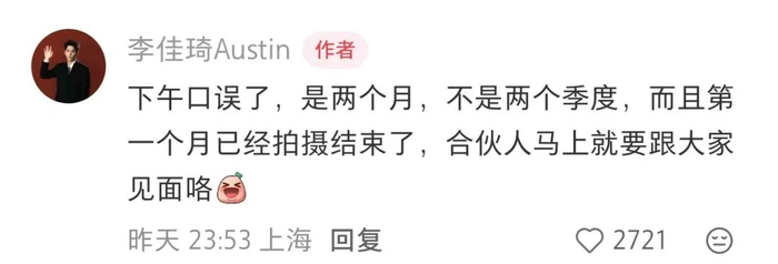 他在演讲中提到,自己可能会“缺席两个季度的直播”,引发外界关注。不过随后在社交平台回应称系口误,实际为“两个月”,且首月相关拍摄工作已完成。