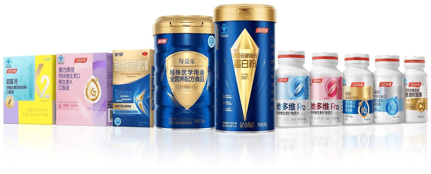 纵向,既往上走,也往下走。“往上走”,是进入高专业壁垒赛道。2025年,汤臣倍健推出了首款自主研发的OTC药品“健力多硫酸氨基葡萄糖胶囊”,以及首款特殊医学用途全营养配方食品“每益乐”,在技术门槛和审批门槛都不低的功能品类赛道进一步扎根。