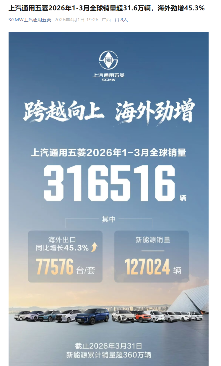 2026年开年,上汽通用五菱交出了一份冰火两重天的销量答卷。最新数据显示,一季度,上汽通用五菱全球累计销量31.65万辆,同比大幅下滑16%;其中3月单月销量13.4万辆,同比下降15%。尽管海外出口表现亮眼,一季度达7.76万辆,同比增长45.3%,但国内主力市场的萎缩已成事实。