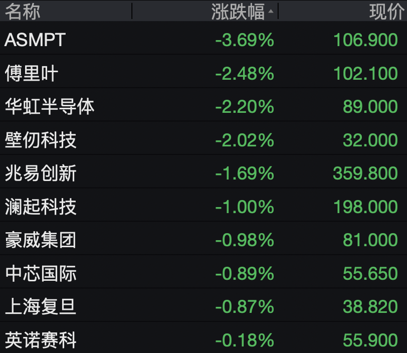 半导体、芯片股回调,兆易创新跌超1%, 澜起科技跌1% 。